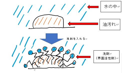 油汚れは、洗剤を使うと、油汚れが洗剤に囲まれ、浮き上がり、簡単に水などで洗い流せるようになる。