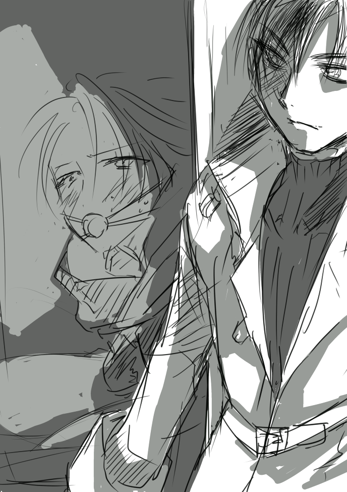 拘束されて、紅潮した顔の、黒装束の若い男。