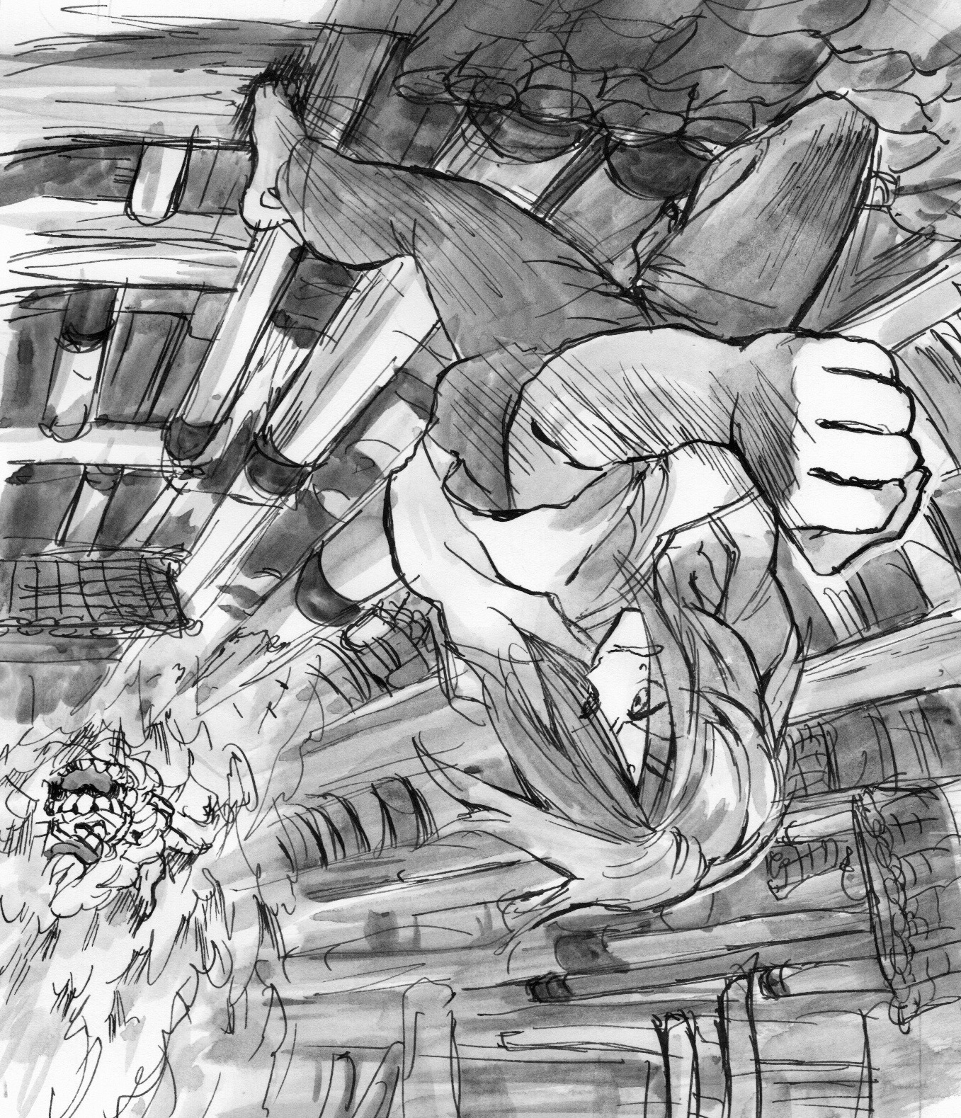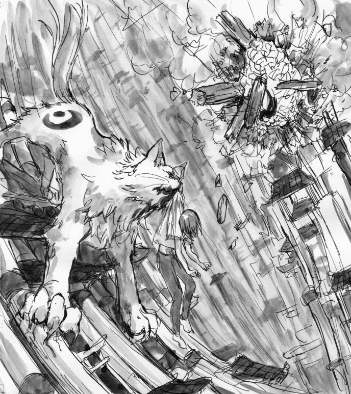 化け物が朔のほうに視線を戻した瞬間、猫は噛み付いた腕を振りかぶって、化け物をぶん投げる。激しい轟音とともに壁に叩きつけられた。壁は衝撃に耐えられずガラガラと音を立て崩れる。