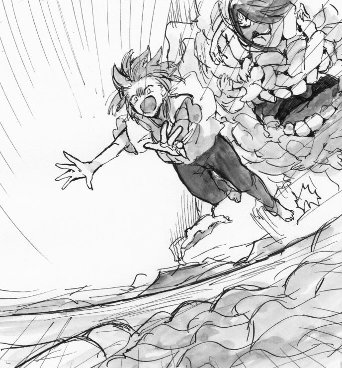 横に振りかぶって、朔を自らの首元へ放り投げる。朔は毛に掴まった。