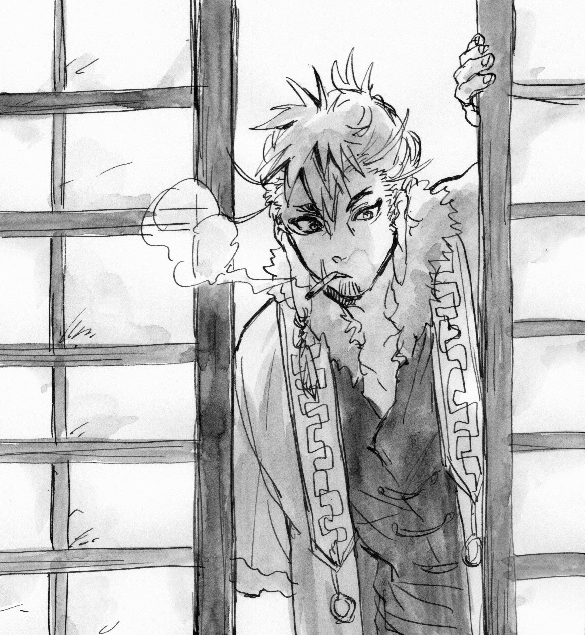 白衣のような羽織に身を包んだ、見たところ中年らしき男。随分と長い、右耳朶についた羽根のピアスが揺れる。髭を撫でながら、眠そうに煙草を吸っていた。