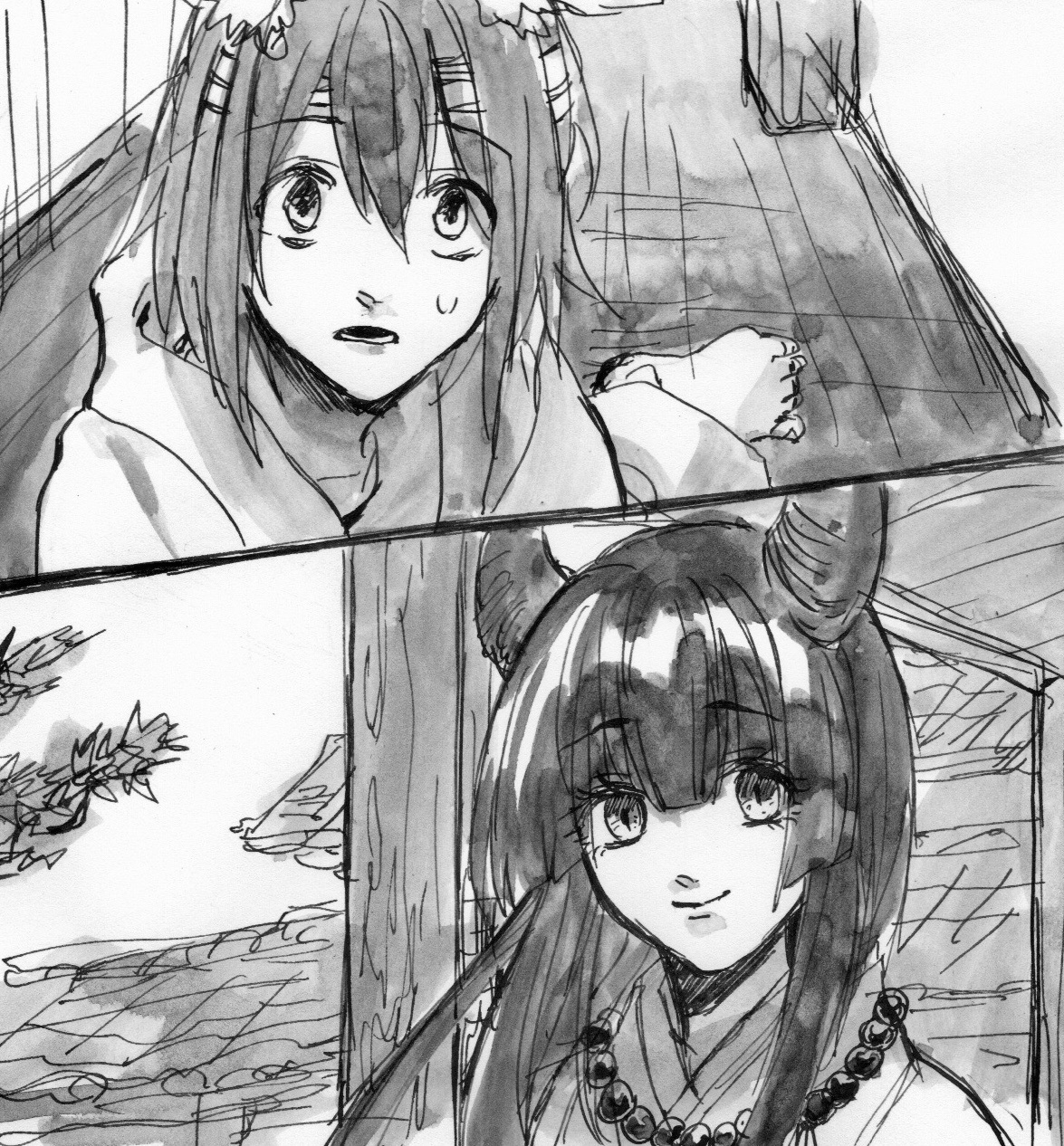 松宵は朔の背後に視線をやる。驚かされるばかりで気配に全く気づかなかったが、朔が振り向き見上げると、そこには……