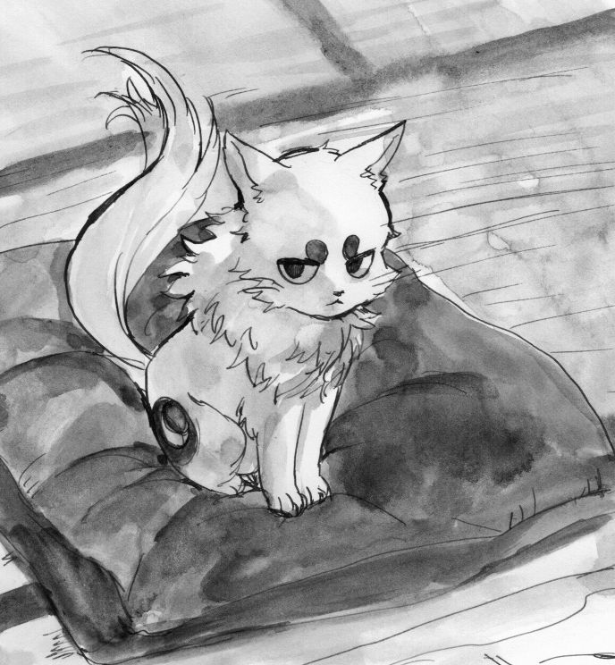 朔のすぐ横にいたのは、座布団にちょこんと座る白猫……だが、見覚えがあるような、ないような。