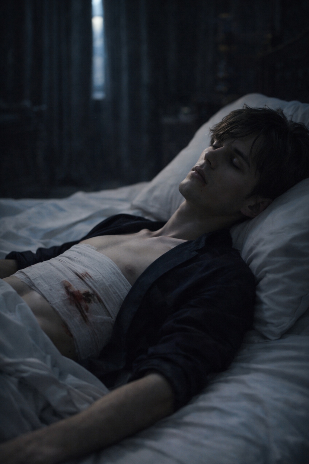 エドワードの腹部は、ヴィンセントが手当てした包帯でまだ覆われていた。2日前の激闘で深く刺された傷は、吸血鬼として覚醒した今でも完全には治りきっていない。人間だった頃の感覚がまだ残っているのか、それとも吸血鬼としての新たな感覚が馴染んでいないのか、傷の痛みが彼を現実に縛り付けていた。