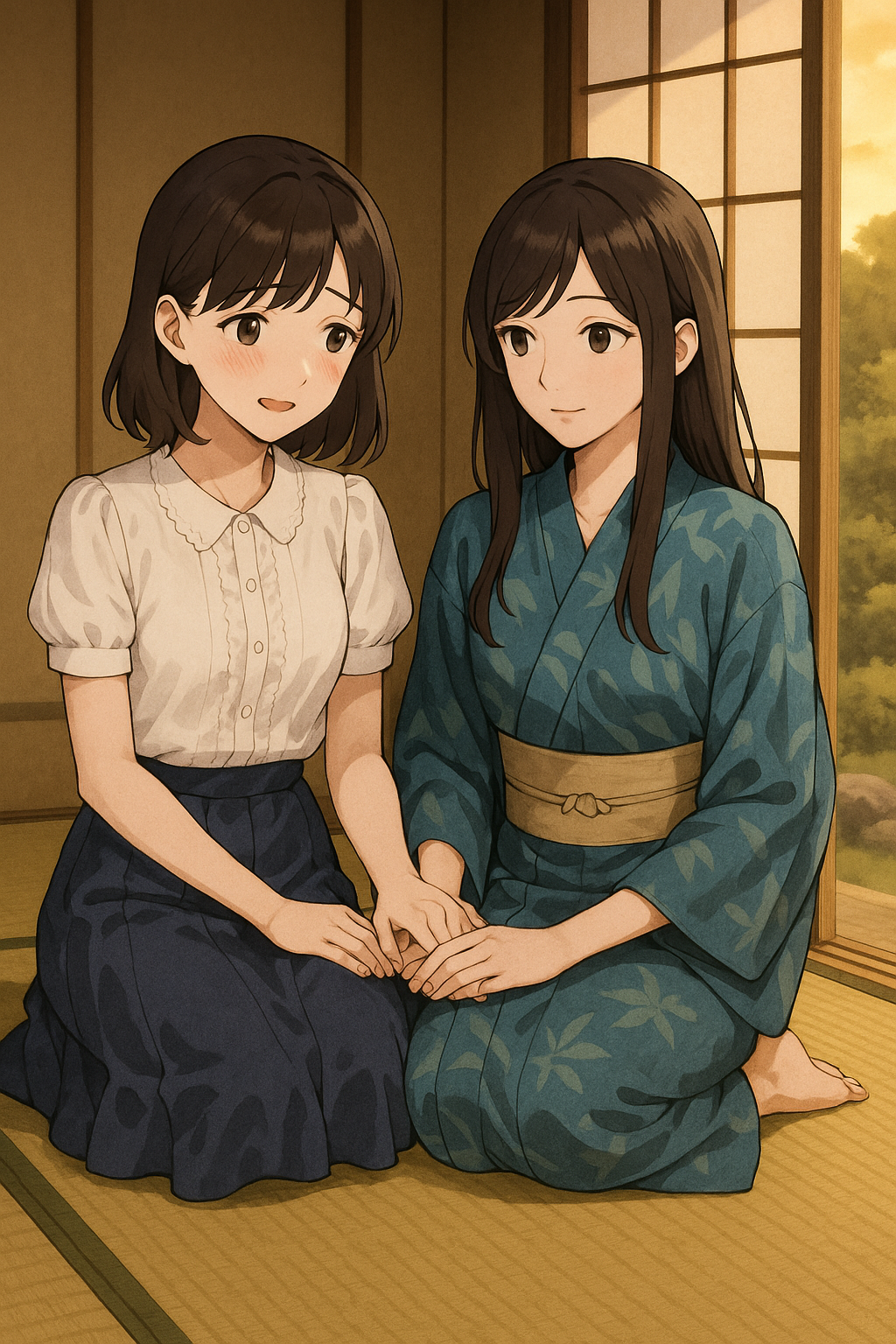 部屋の端に置かれた姿見の前で、浴衣の襟を整えてもらいながら、私は少し息を止めていた。