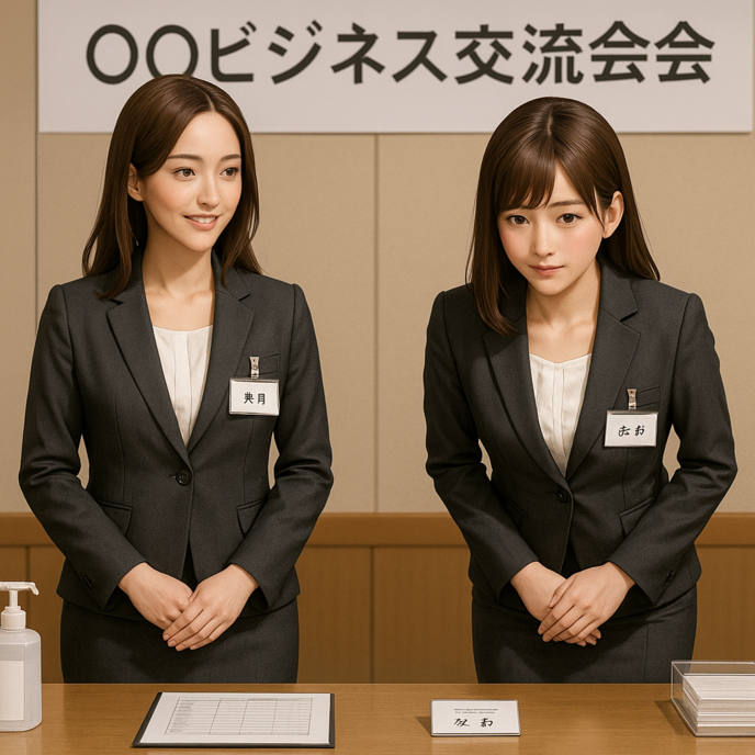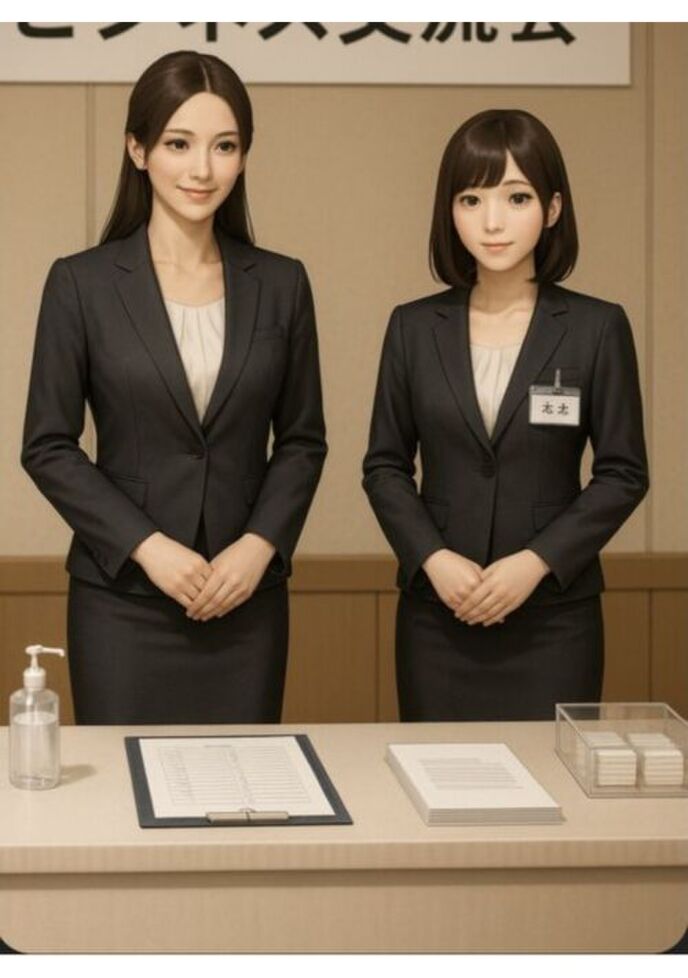ホテルのホール前。来場者は続々と現れ、なおと美月は、受付デスクの前に並んで立つ。