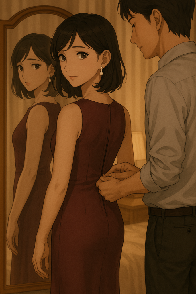 河合がズボンを戻し、そっとなおのドレスの背中に手を回す。