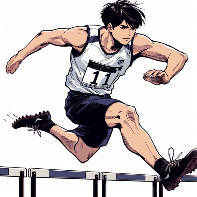 スタンディングからスタートして1台目、歩幅を無理して合わせてジャンプすると思いのほか高くとびあがってしまった。右足で着地。左、右と慎重に足を運び次の左で踏切った。が、膝を伸ばした振り上げ足を意図的に引きつけて振り下ろすことも、左足を横から回して高く引き付けることもできない。パタンと右足のすぐ近くに降りてきた左足が次へのエネルギーを吸収してしまったようで、前に進む力はがくんと落ちた。3台目は越えられなかった。男子用のハードルに比べるとかなり低い高さに設定されていても、目の前のハードルはやはり「障害」として僕の前に立ちはだかっていた。障害を越えられない恐怖のようなものを感じた。手でハードルを抑えて立ち止まった。