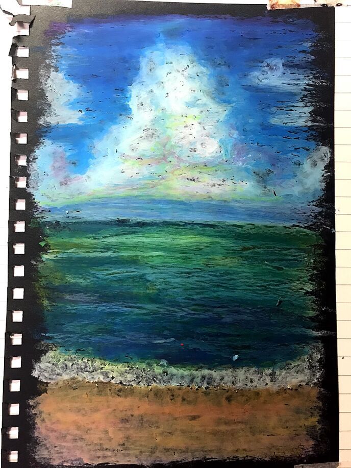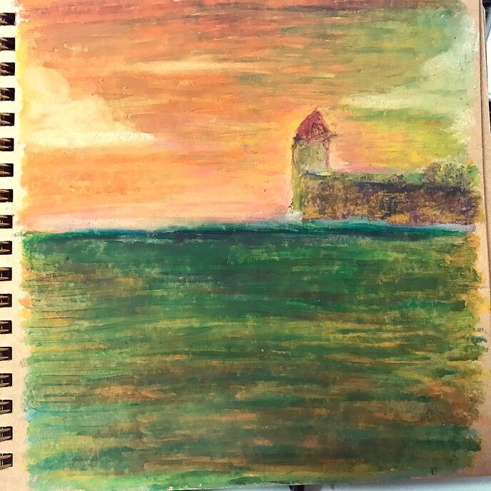 さすがに画面上下2分割ばっかの絵はヤバたんと思ってちょっと今回は海岸描いてみました。風車塔かな。教会かな。ここに風車塔置けるのか知らんけど。