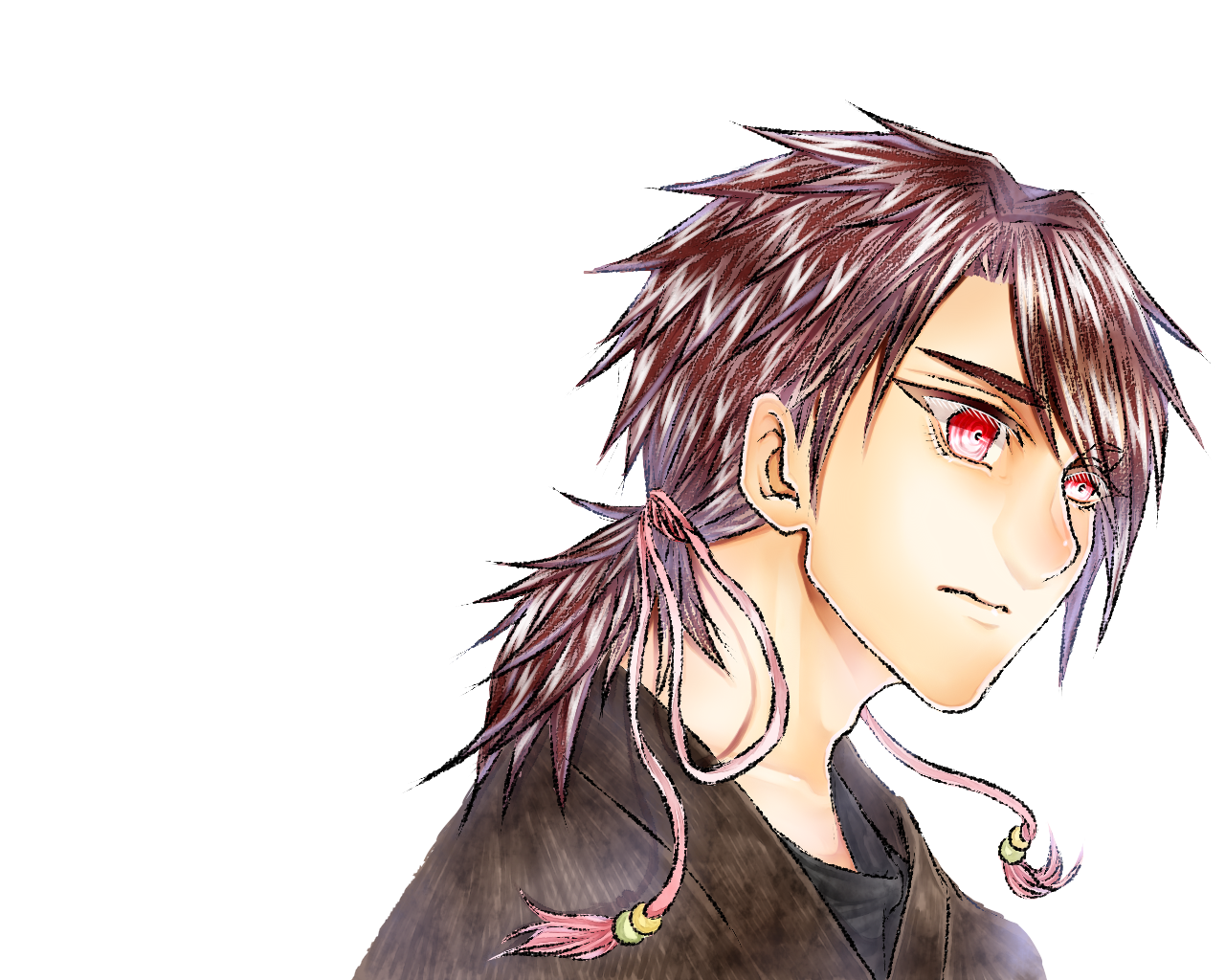 男寡(配偶者が死んだ男のこと)設定があるので髪紐は亡妻の帯締めです。妻の名前は早苗色がモチーフの「真苗」なので黄緑色っぽいの付けてたっぽく見えて夫の桜色の帯締め付けていたっていう裏設定みたいな。