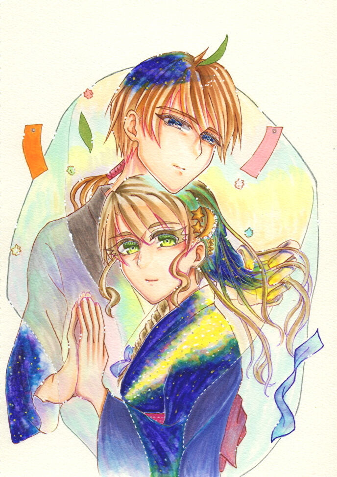 七夕ってもう織姫・彦星がどうのこうのよりも、離れていてなかなか会えない人に会える日、みたいな認識で、だとすると自創作「彩の雫」なら極彩と狐だよなっていう。この夫婦はセルフ二次創作的な意味ではセルフ推しCPです。縹×極彩はシリアスになるので、こっちは割りとほのぼので。