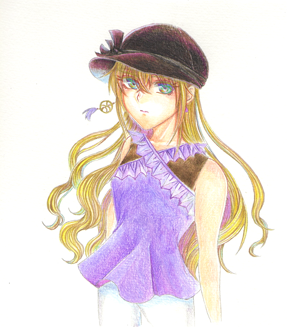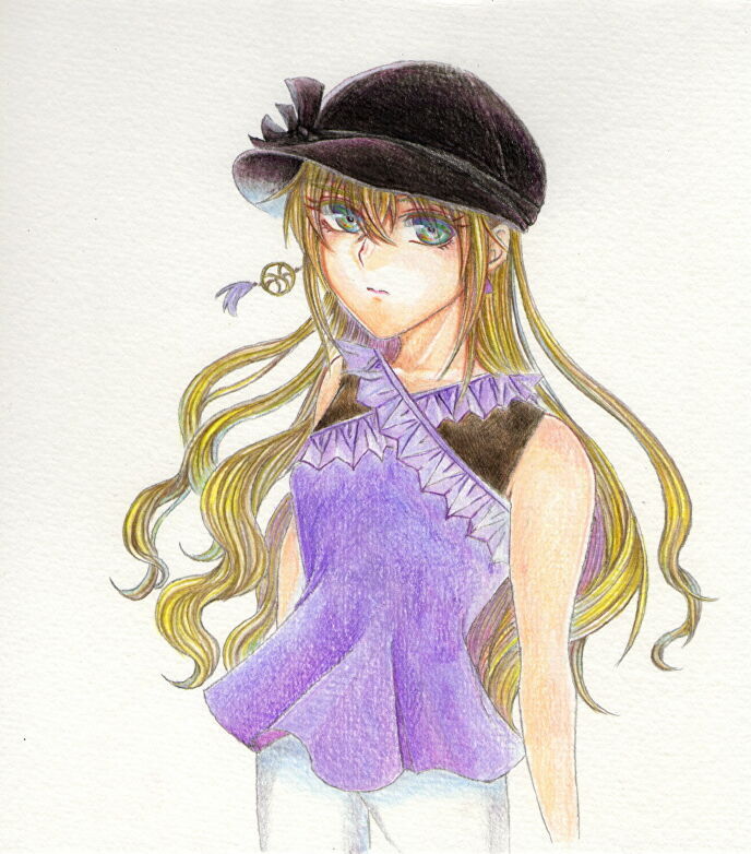 別創作のヒロインを塗るために選んだ色鉛筆の試作みたいな形になってしまったのですが、いい感じに金髪に馴染んだのではないでしょうか。巻き髪は塗ってて楽しいです。