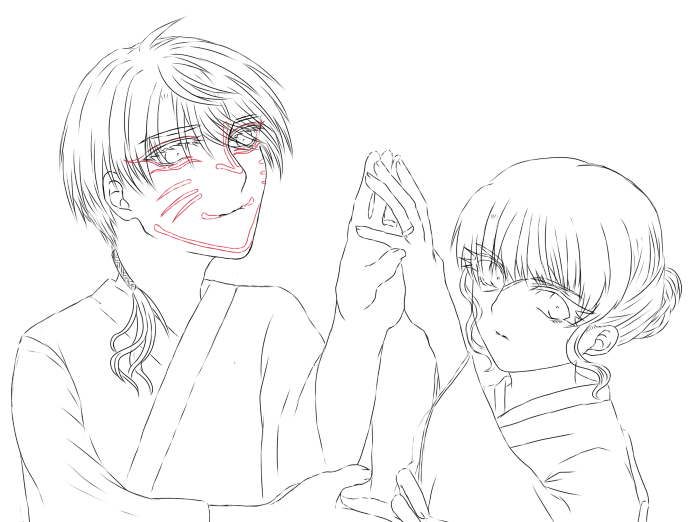 そして今度は描いているうちに、妻側のほうは夫とそんな風にするガラじゃないし、3案目は妻だけで夫無しでやろうと思っていたのですが、これは本編のイメージイラストではなくて季節絵なのでそこまで本編忠実にしなくてもいいんだがって感じではあるのですが、やっぱり解釈違いというやつ(解釈違いという名の理想の押し付け)で、1枚完成して2枚目の線画だけのも描き終って早くBL版のほうを仕上げるべきところを余計に1枚描いたという。これは苦労自慢話ではなくて何やってんのこいつ…っていうやつ。あとそういう経緯っていう備忘録。しかもBL版のほうは間に合っていないという。