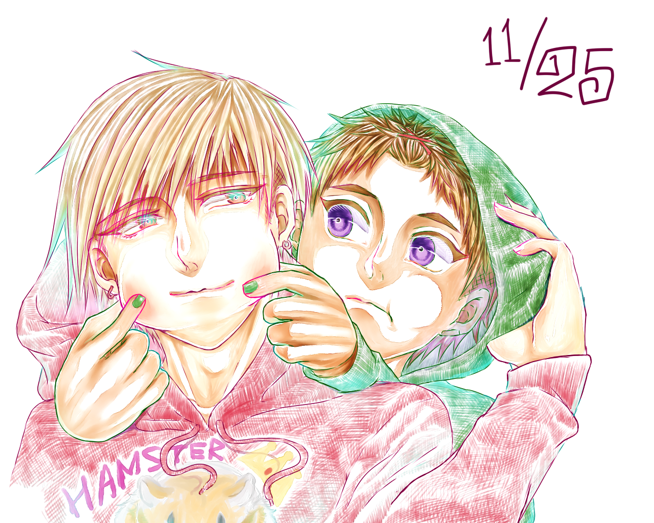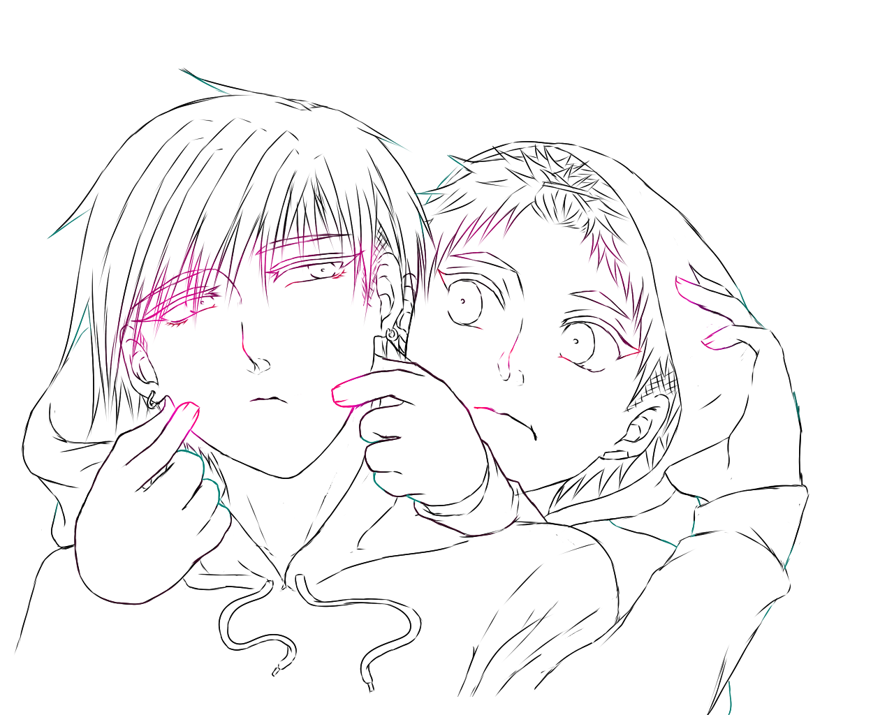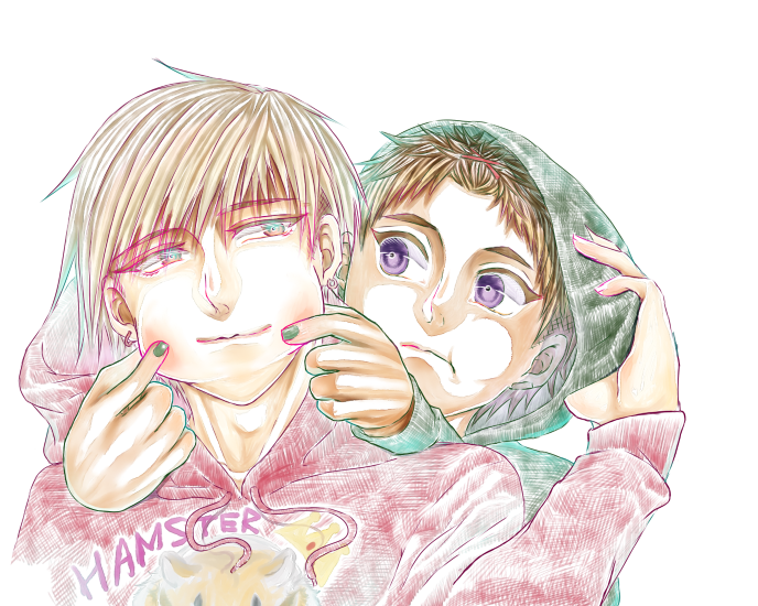 右の人は口開けて笑わせないと目がデカい分、虚ろな感じがしてちょっと怖い。ただでさえわたくしの絵って表情硬いので。なんでどいつもこいつもぶすくったれてるの?っていう。