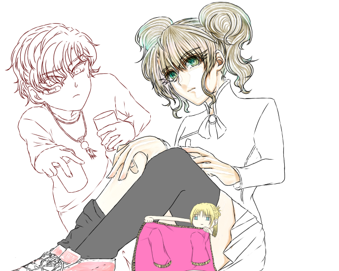 ニーハイver.のほうは左の人の目も吊り気味になっています。こっちのほうが元のキャラデザには近いのですが、本編イメージイラストよりも季節絵として本編にそこまで依存しない絵として、かわいげがないなって感じでちょっと丸みのあるほうが正規絵ということにしました。
