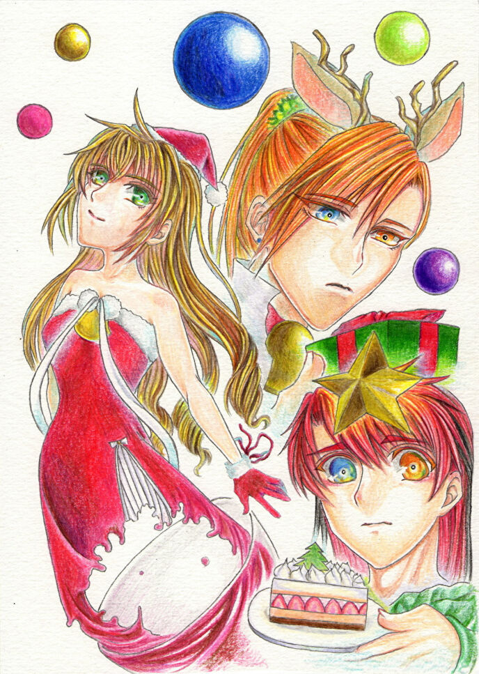 幼馴染でメイン3人組です。青みの入った赤と黄味の強い赤というか朱色の2人。影武者設定なのがおかしいですわ。