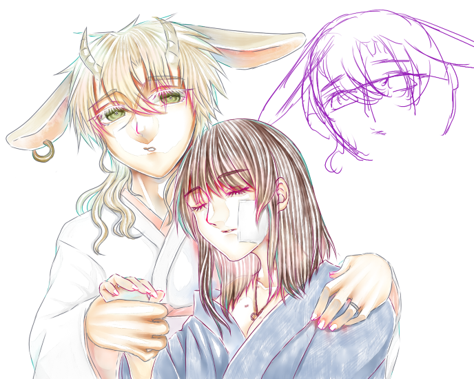 右のラフ気に入ったので、この感じで描きたいと思って。このラフは干支絵になるはずだったんですけど。