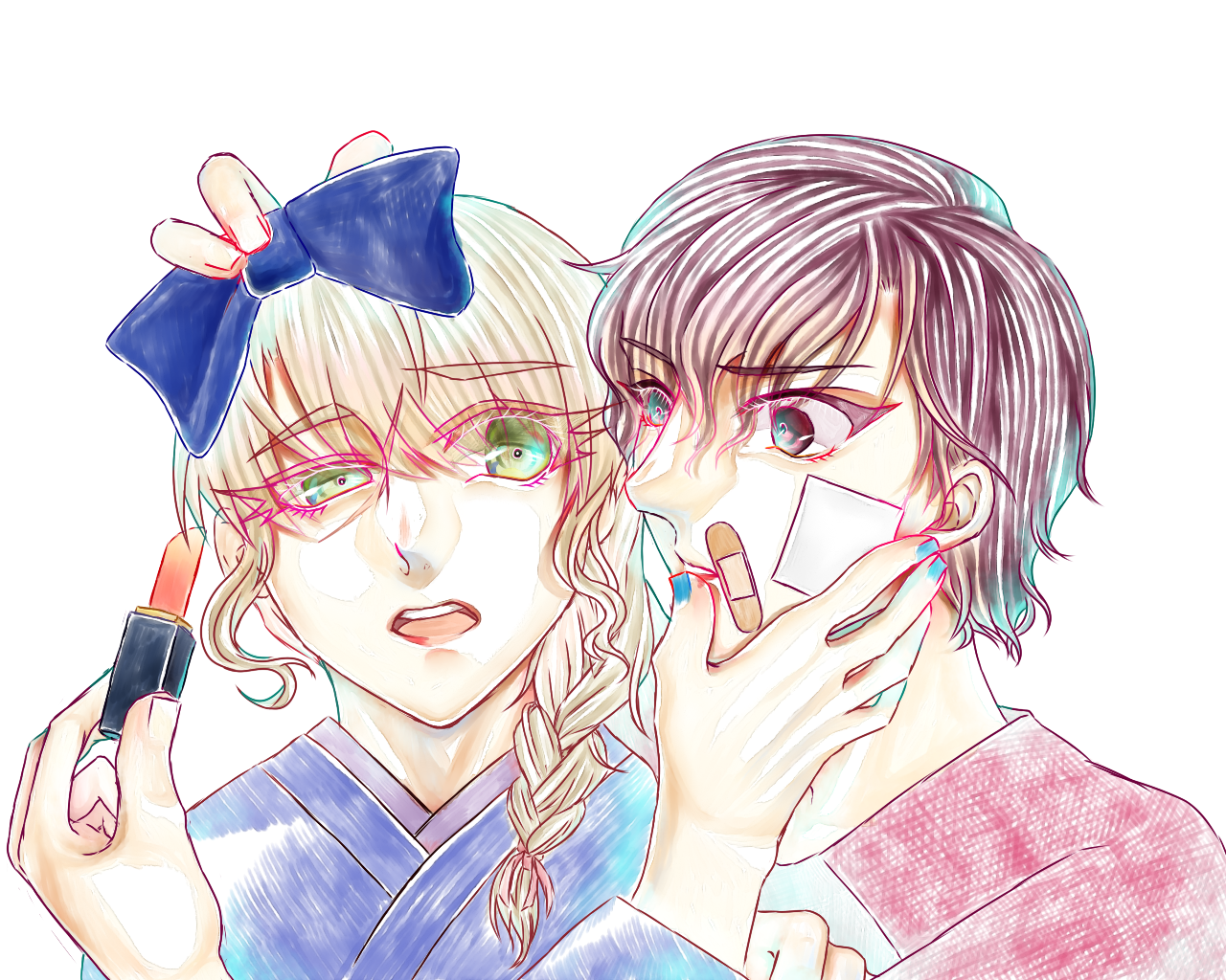 右の人は珊瑚でイメージカラーが赤ピンクなので、この場合左の人の頭にあるリボンは赤~濃ピンクであるのがカプ絵の嗜み(違います)だと思うんですけど、青色です。これは匂わせです。