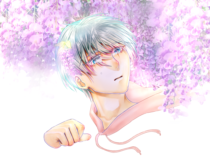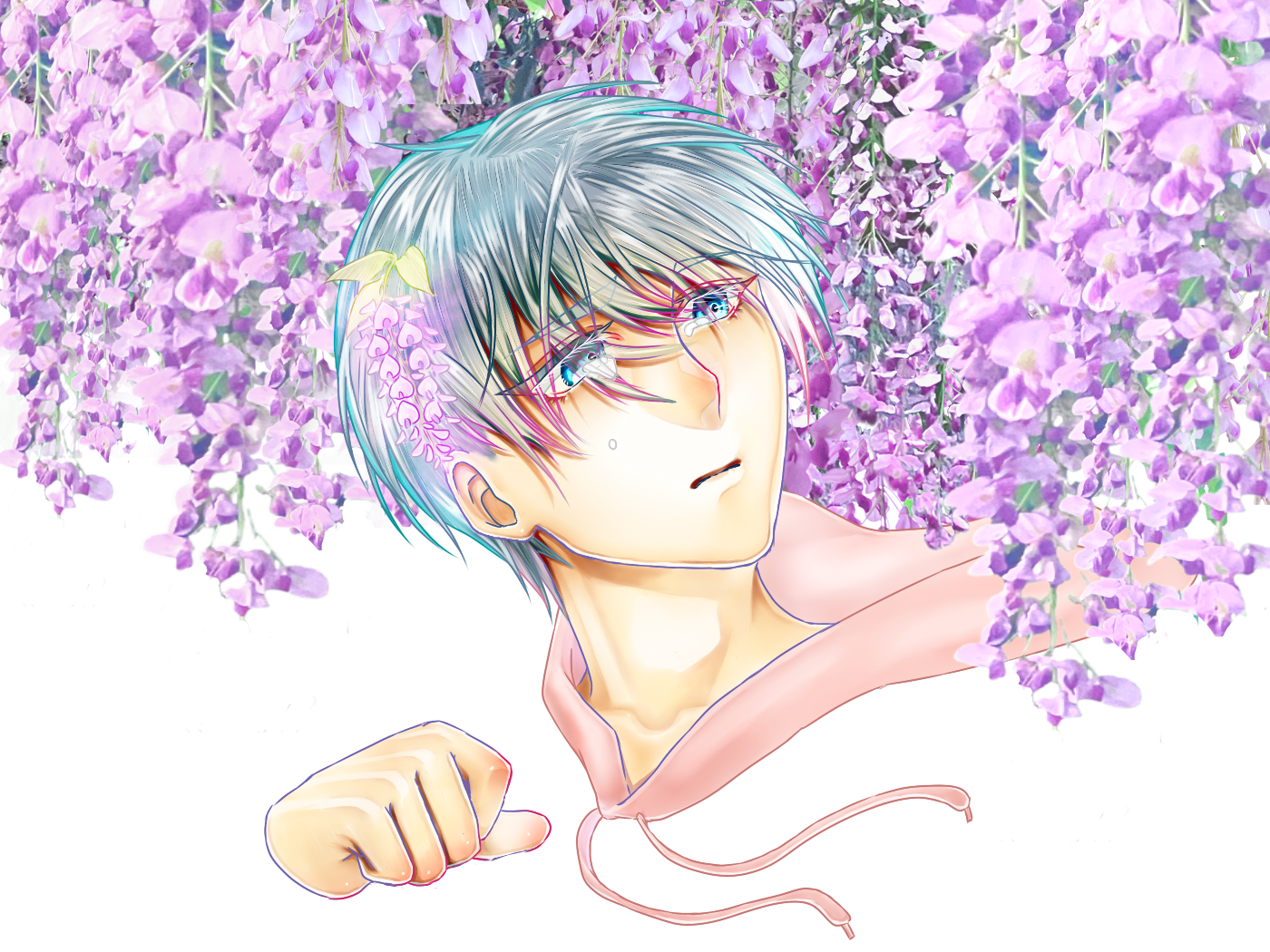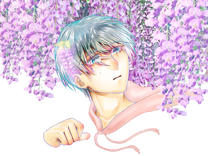 構想はもう決まっていて、手描きするつもりもあったのですが、面倒臭そう過ぎてやめました。通勤途中にある藤の花を撮って、それを切り抜き、ガウスでぼかせばいいか、みたいな。
