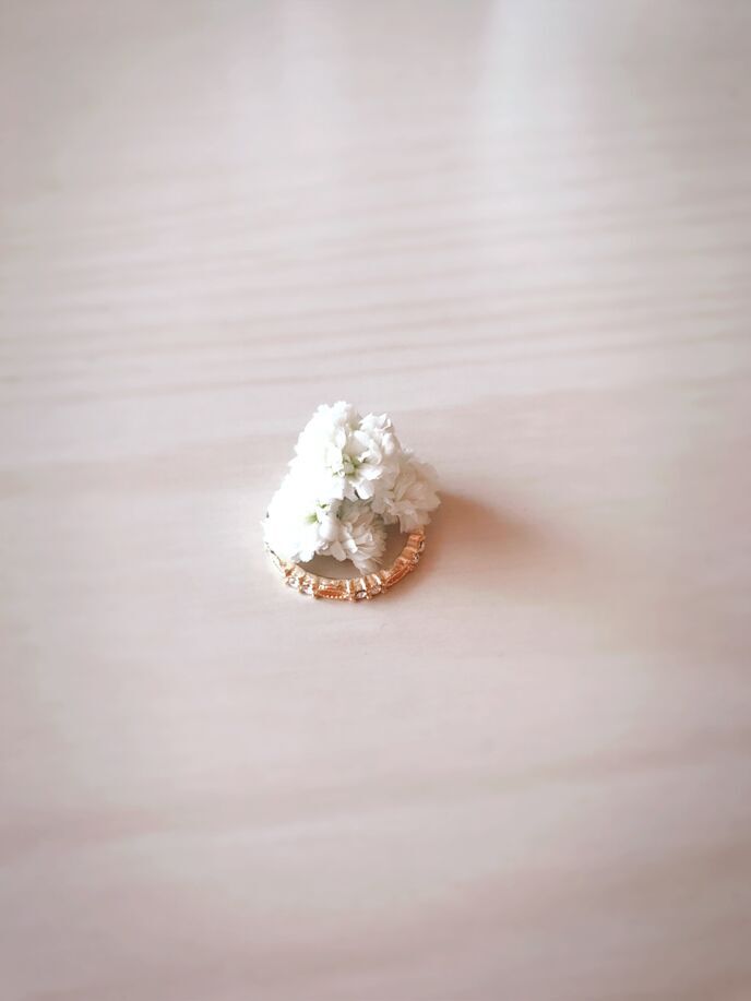 カスミソウは数本のオレンジ色のガーベラとセットになっていたやつです。花がぽろぽろ落ちてきちゃって、それを捨てるのもなんだかな…ったところで、買ったばかりのピンキーリングとなんかちょっと匂わせっぽい感じで撮りました。