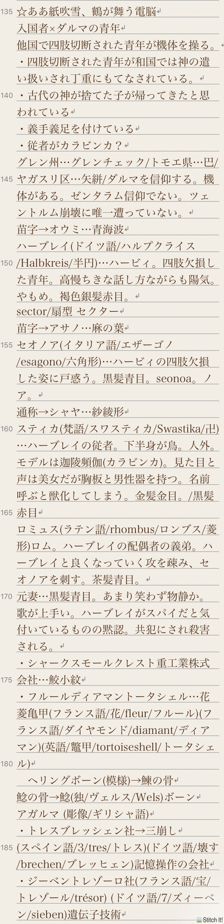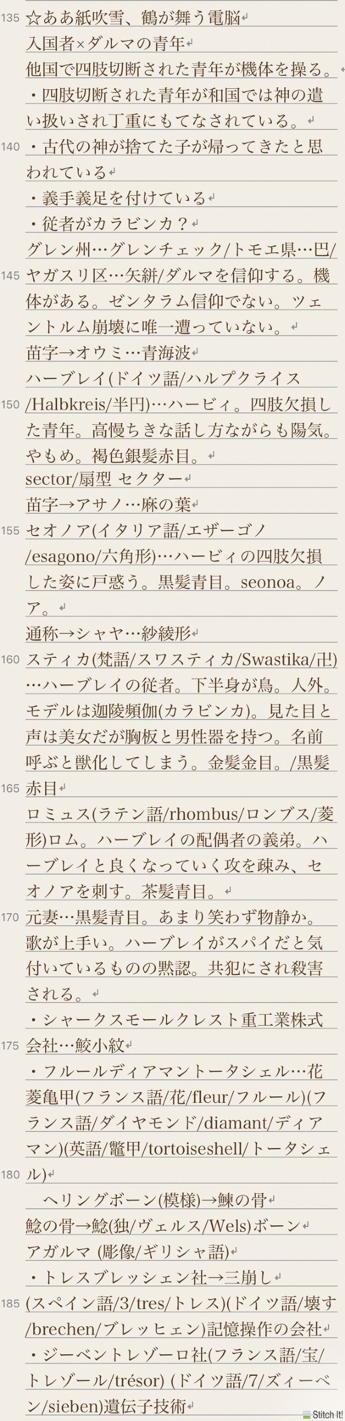 タイトルは世界観を一言で表現したくて、少し長いです。わたくしの地元県の形から取って「鶴が舞う」で、紙風吹で和風なイメージを醸しつつ、電脳でサイバーとかデジタルとか機械っぽい、文明の利器を彷彿させる単語を使いました。自分はそうは思わん!という人は居るだろうけどわたくしの知るところではない。全ての人と共感出来たらこの世はつらかないからね。