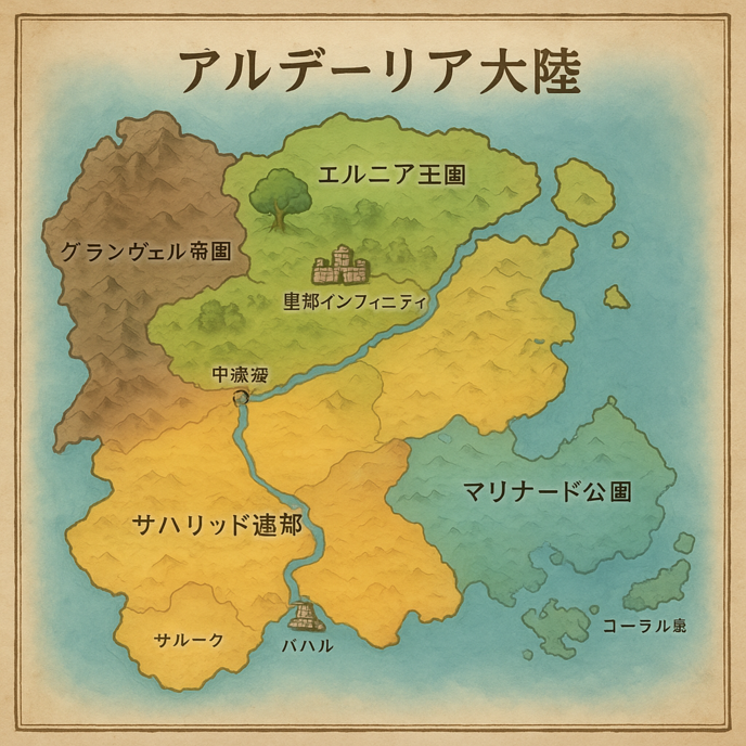 アルデーリア大陸は、広大な自然と多様な文化が共存する中規模の大陸。北部にはエルニア王国が位置し、南部には砂漠と交易都市が広がるサハリッド連邦、東部には海洋国家のマリナード公国、西部には山岳と魔法文明のグランヴェル帝国がある。大陸中央には「中央大河」が流れ、交易と文化交流の要となっている。気候は北部が温暖、東部が海洋性、南部が乾燥、西部が冷涼で、各地の風土が文化や産業に影響を与えている。