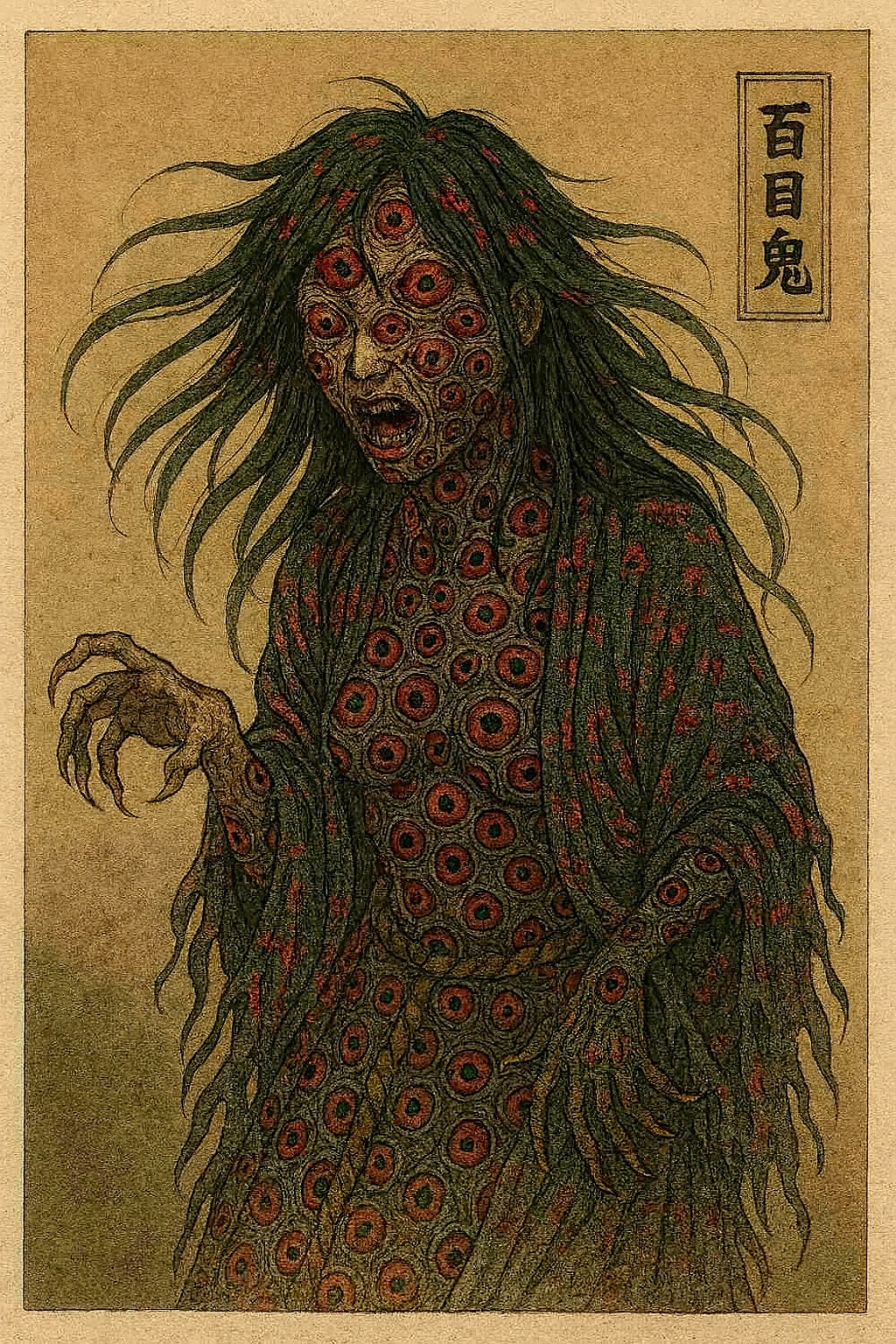 Copilotに百目鬼「百目鬼。百鬼夜行に出てくる、妖怪に、百の目を持つ妖怪として、百目鬼が居る。百の目を持つ、女性の妖怪を描いて」