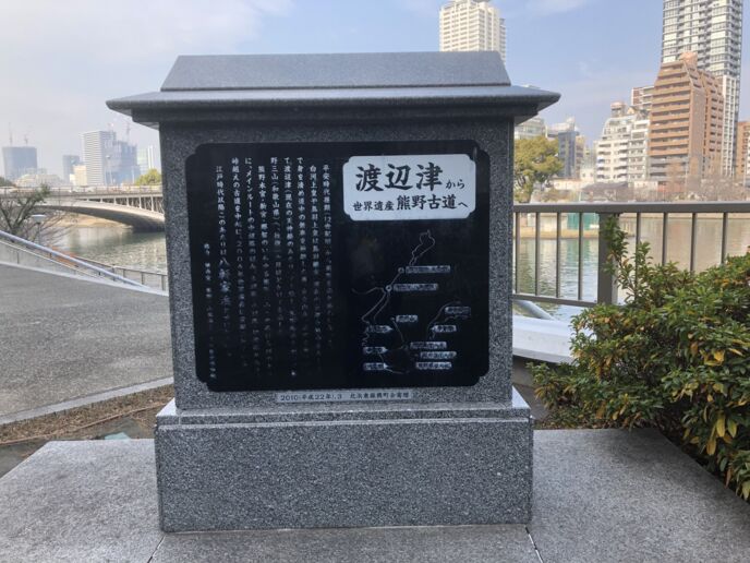 上町台地の北端、淀川と別れる大川に、渡辺津がありました。京洛から船で川を下り、渡辺津で降りると、熊野街道の起点となり、南に向かうと四天王寺、大和川を越えて、熊野権現に繋がる街道となります。
