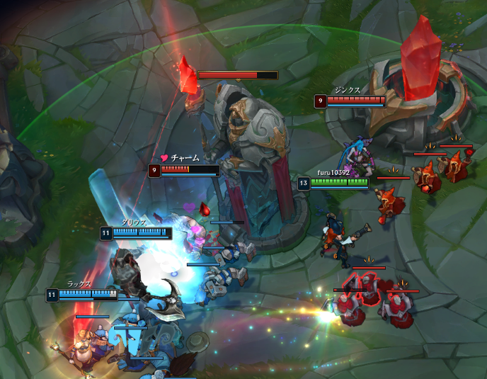 しかし、喜ぶ間もなく敵のチャンピオンが二人同時に現れた。それでも、チャンピオンは五対二で、圧倒的に有利な状況だ。少し卑怯なようだが五人がかりで、敵チャンピオン二人を殲滅した。