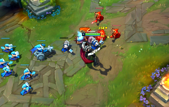 ミニオン同士の戦いでは、お互いライフを削りあう。あと一撃で倒せると思った時に、チャンピオンがミニオンに攻撃を仕掛ける。ぴったりとタイミングが合えば、ラストヒットになりCSが取れるが、早すぎても遅すぎても駄目だ。
