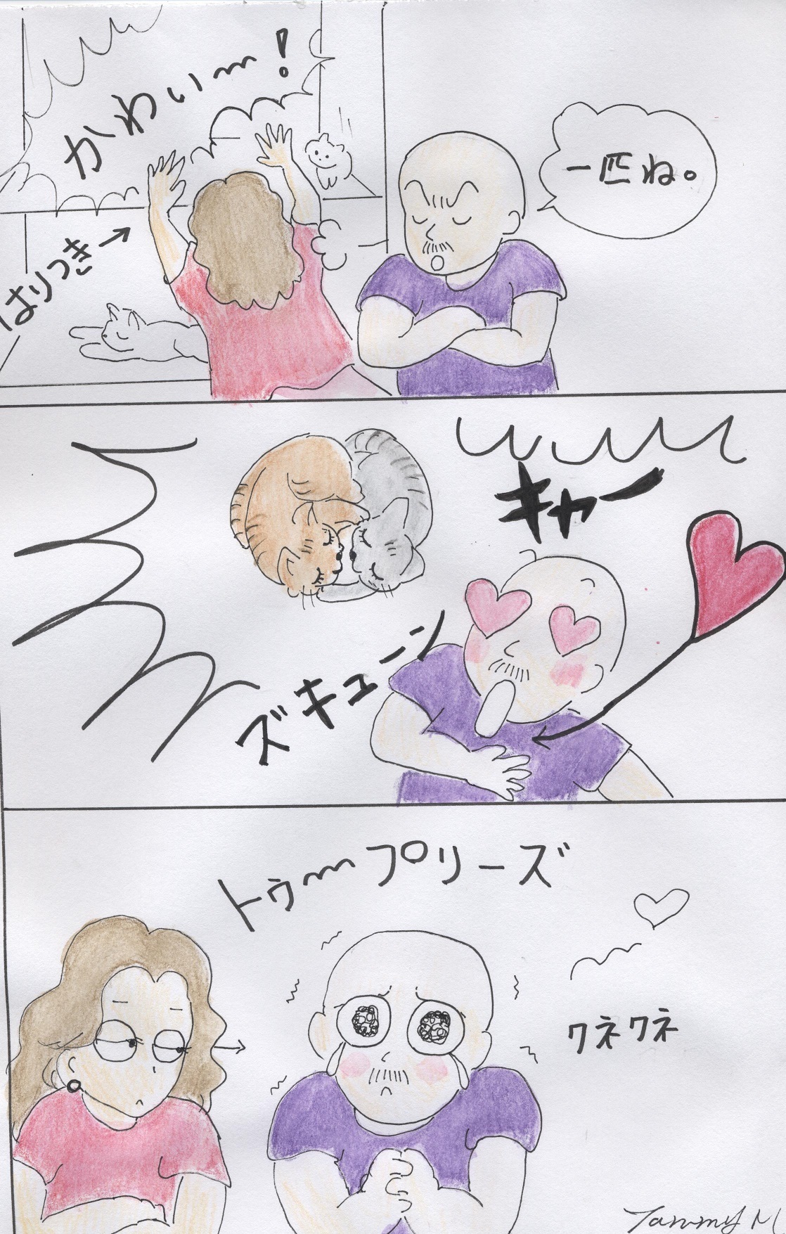 家族皆ねこが好きだったが移動の多い軍生活なので引退してから飼おうと決めていた。しかし動物が特に大好きな母に元気になってもらいたいと、少し早かったけれど猫を飼うことに決めたのだった。