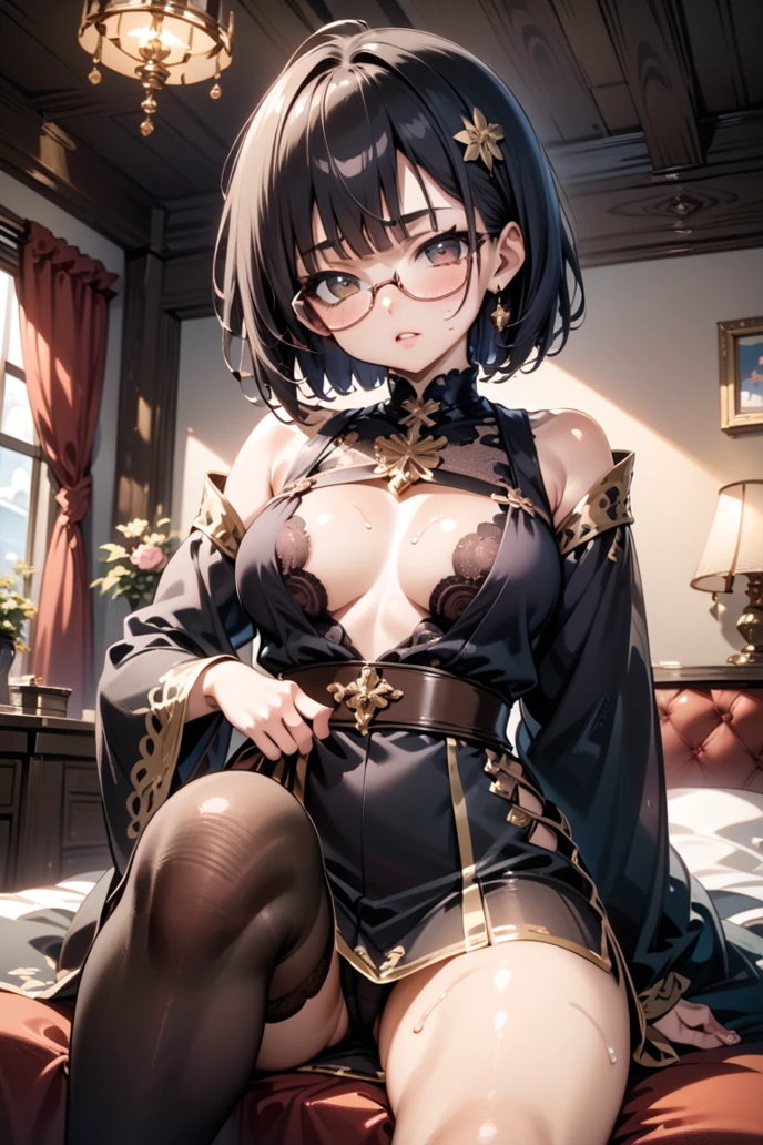 髪型・瞳: 艶のある黒髪ボブカット。分厚い眼鏡の奥に理知的なヘーゼルの瞳。