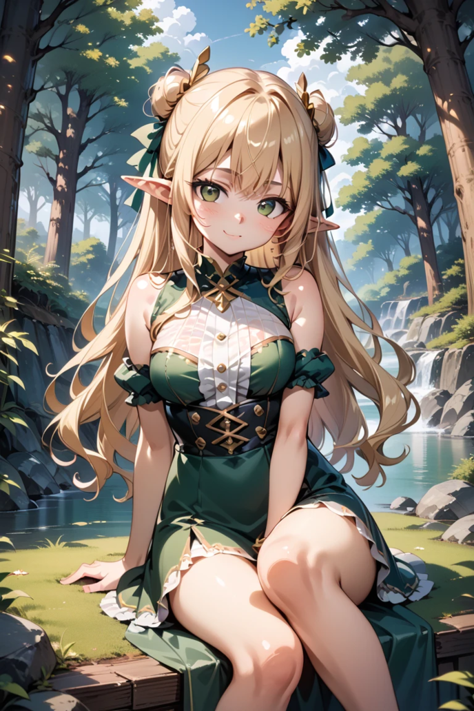 髪型・瞳:地面につきそうなほど長い波打つ金髪。新緑のようなエメラルドグリーンの瞳と長い尖った耳。