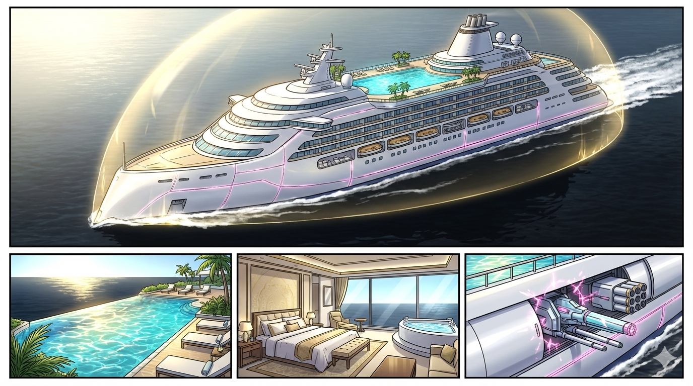 上層部にはガラス張りの客室が立ち並び、最上部には巨大な煙突とレーダー、そしてプールが見える。