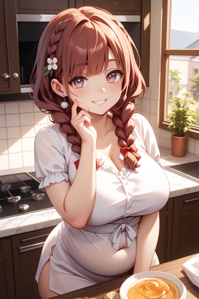 料理をする時は邪魔にならないよう、緩いサイドテールや三つ編みにまとめ、シュシュで留めている。