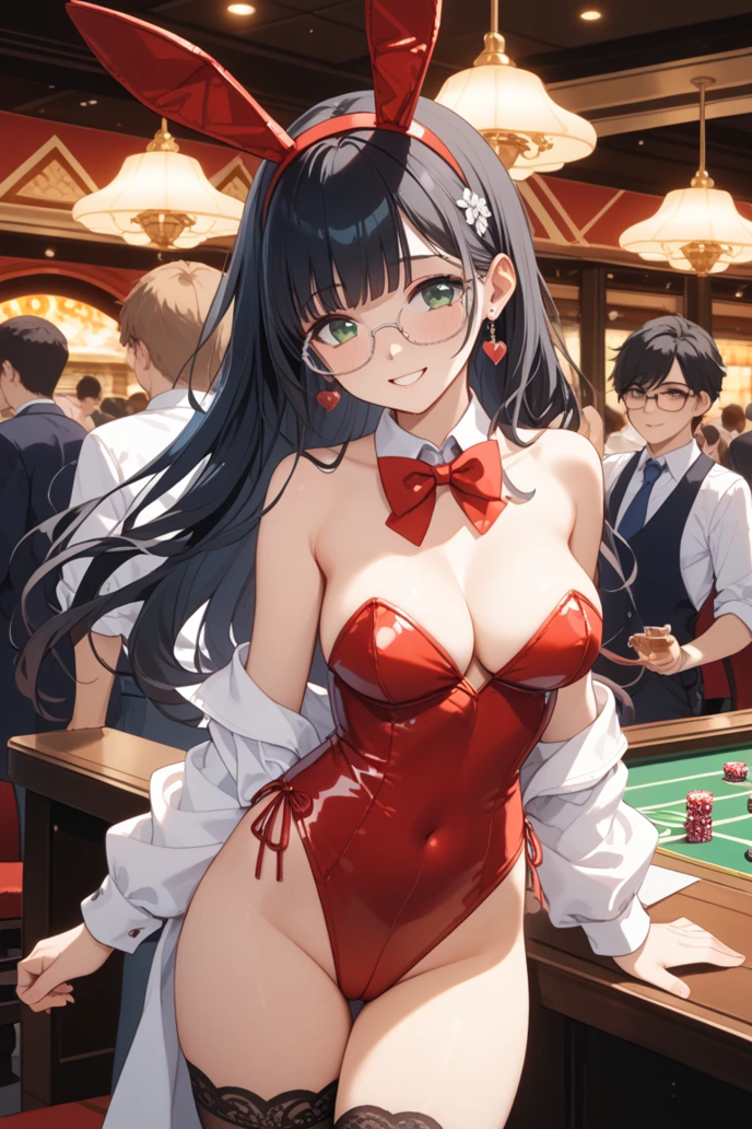黒と赤の光沢あるレオタードに、網タイツ、そして頭にはウサギの耳。