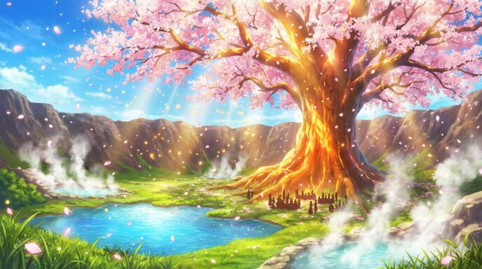 幹は琥珀色に輝き、枝は空を覆い尽くすほどに広がり、そこから無数の花――日本の桜によく似た薄紅色の花が一斉に咲き誇った。