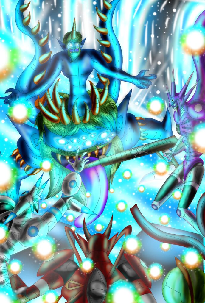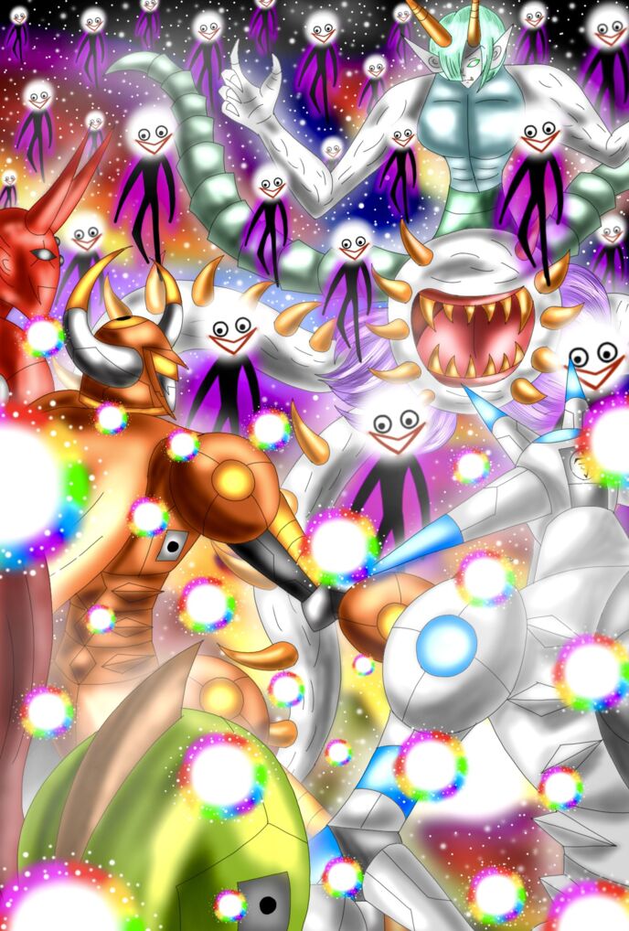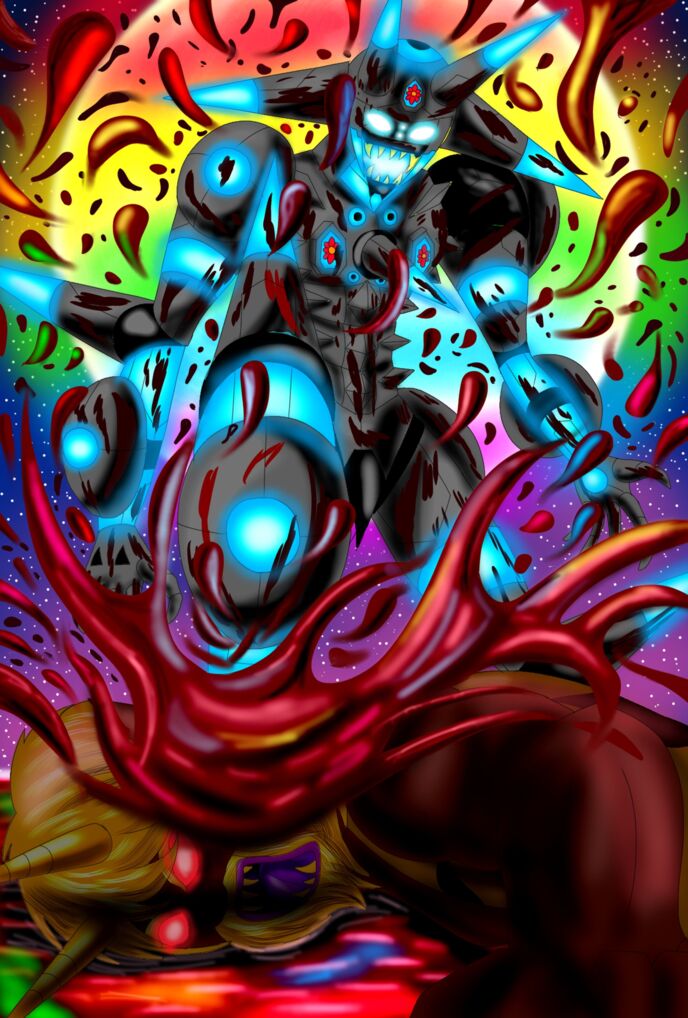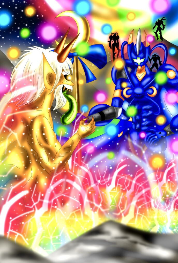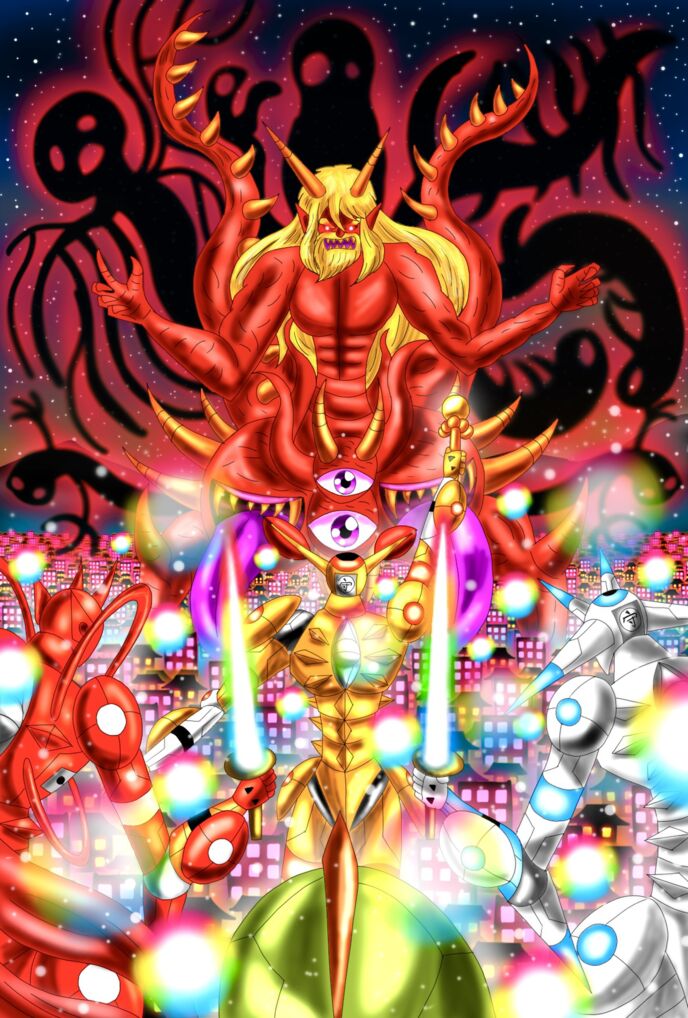 そして、神仏郷には五大魔王の一番手として動き出した、黒神大魔王の魔の手が伸びていた。黒神は夜道を歩く神々の背後から、密かに現れては、自身の拳を使い、神を勢いよく殴り、真っ二つにし、惨殺したのだ。黒神はそれをひたすらに繰り返していたのだ。黒神により、次々と撲殺されていく神々。夜の神仏郷は、たちまち血の海へと変わっていくのだった。こうして、神々は、一日のうちに数万人も惨殺されたのだ。そして、黒神は「よし。あとは奴らを誘き寄せるだけだ」と不敵に笑うと、下半身が蛇とムカデのような脚で構成された、不気味な姿へ巨大化していく。そして、「出てこいアミーダ。俺が相手してやる」と挑発した。
