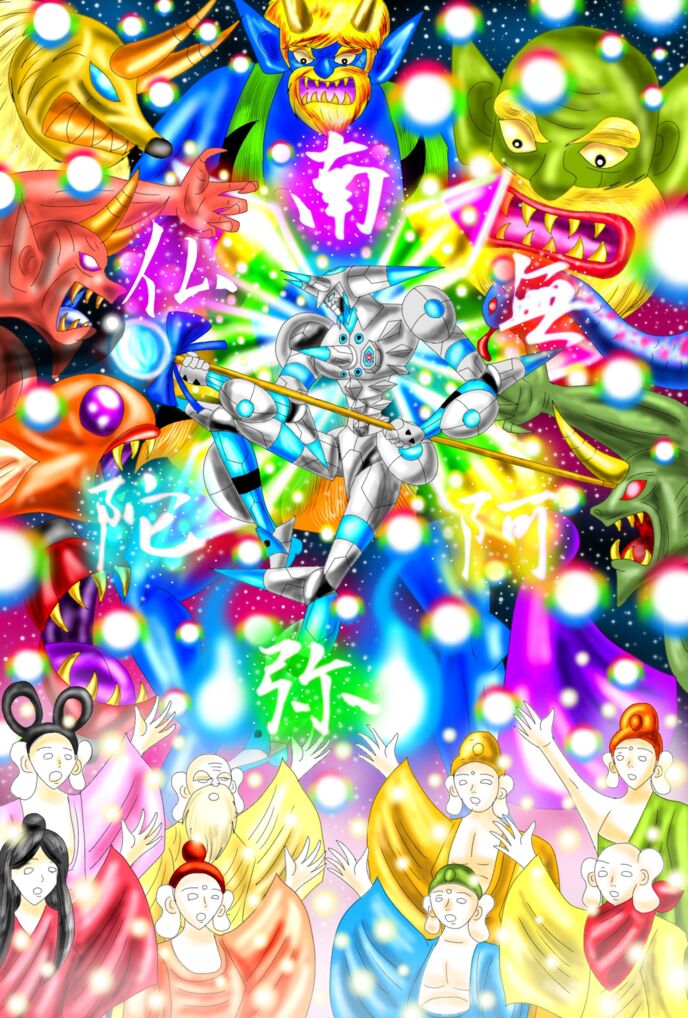 順調に戦ってきたナオト達。そこへ、約六十五キロの巨体、六十四の目、口からは火を吐く奇怪な鬼のような妖怪・ムゲン鬼が現れた。しかも、その数は約十八体だ。ナオトたちは、やってやるとアミーダ三機で立ち向かう。しかし、ムゲン鬼は強靭な身体でアミーダ三機の攻撃を吸収、無効化。更には口から吐き出す炎で、アミーダ三機は苦しめられ、更には戦闘不能へと追い込まれてしまう。その隙をついて、ムゲン鬼の群れは、アミーダのエネルギー補給施設である阿弥陀仏像を一撃で破壊してしまうのだった。アミーダの敗北により、神仏たちは絶望、ただ妖怪によって仏界が滅亡するのを待つだけとなってしまうのである。