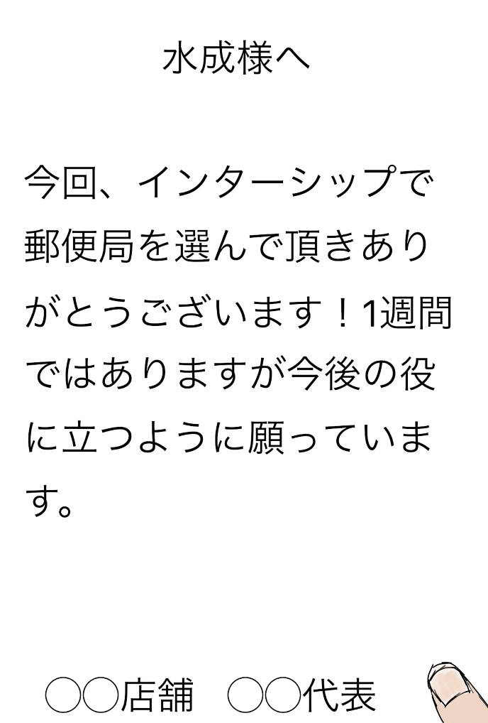 1週間が終わり同時にインターンシップが終わった。お世話になった方にお礼をし、最後に郵便局の方に「楽しかったかい?」と聞かれた、そうしたら自分は「はい!楽しかったです!」と答えた。そうしたら「うちで将来働くかい?」と冗談なのか本当なのかわからないが言われた。正直嬉しかった。