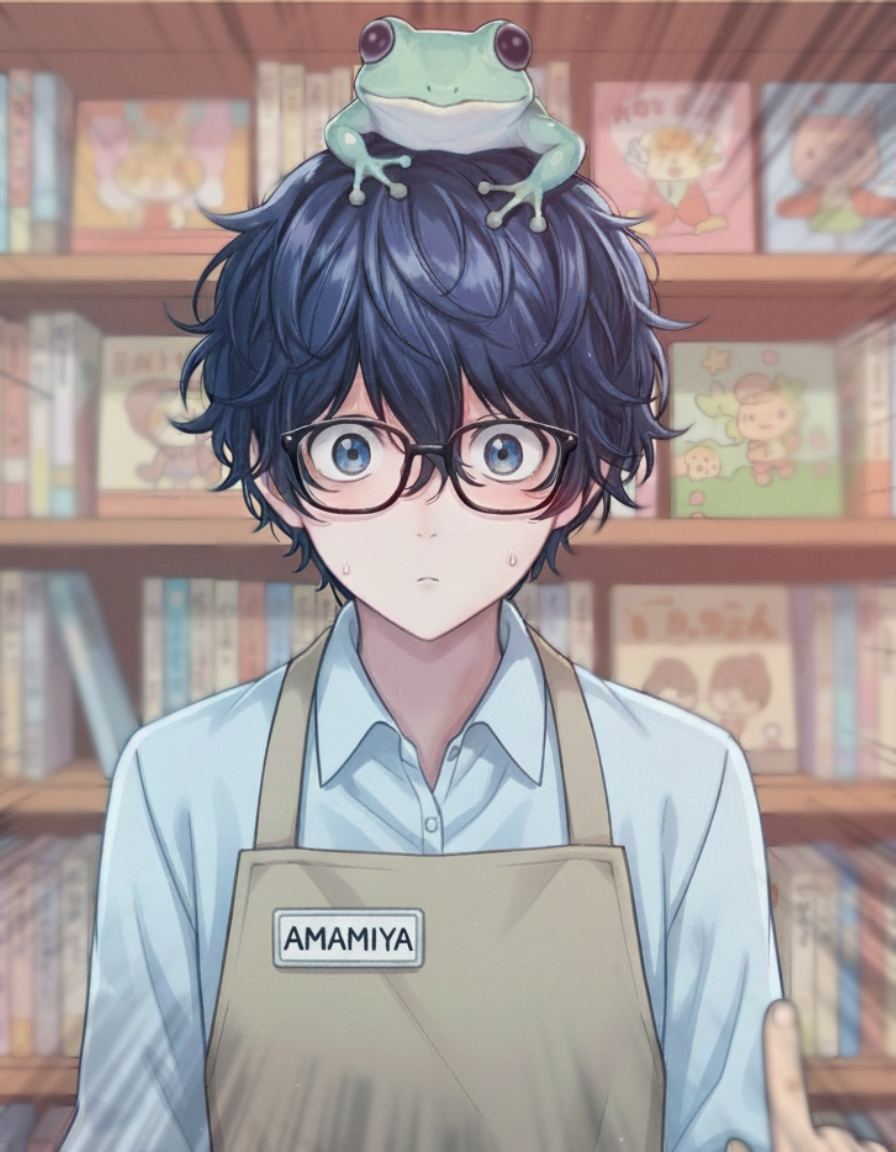 心臓が一度、妙な跳ね方をした。思わず頭の上に手が上がる。――でも、女の子の指さす先は俺の後ろの棚。面出しの絵本『かえるのねがいごと』が、照明で緑に光っていた。