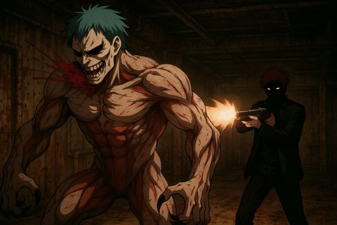銃口付きの機械アームが天井から降下し、彼の額を正確に捉える。