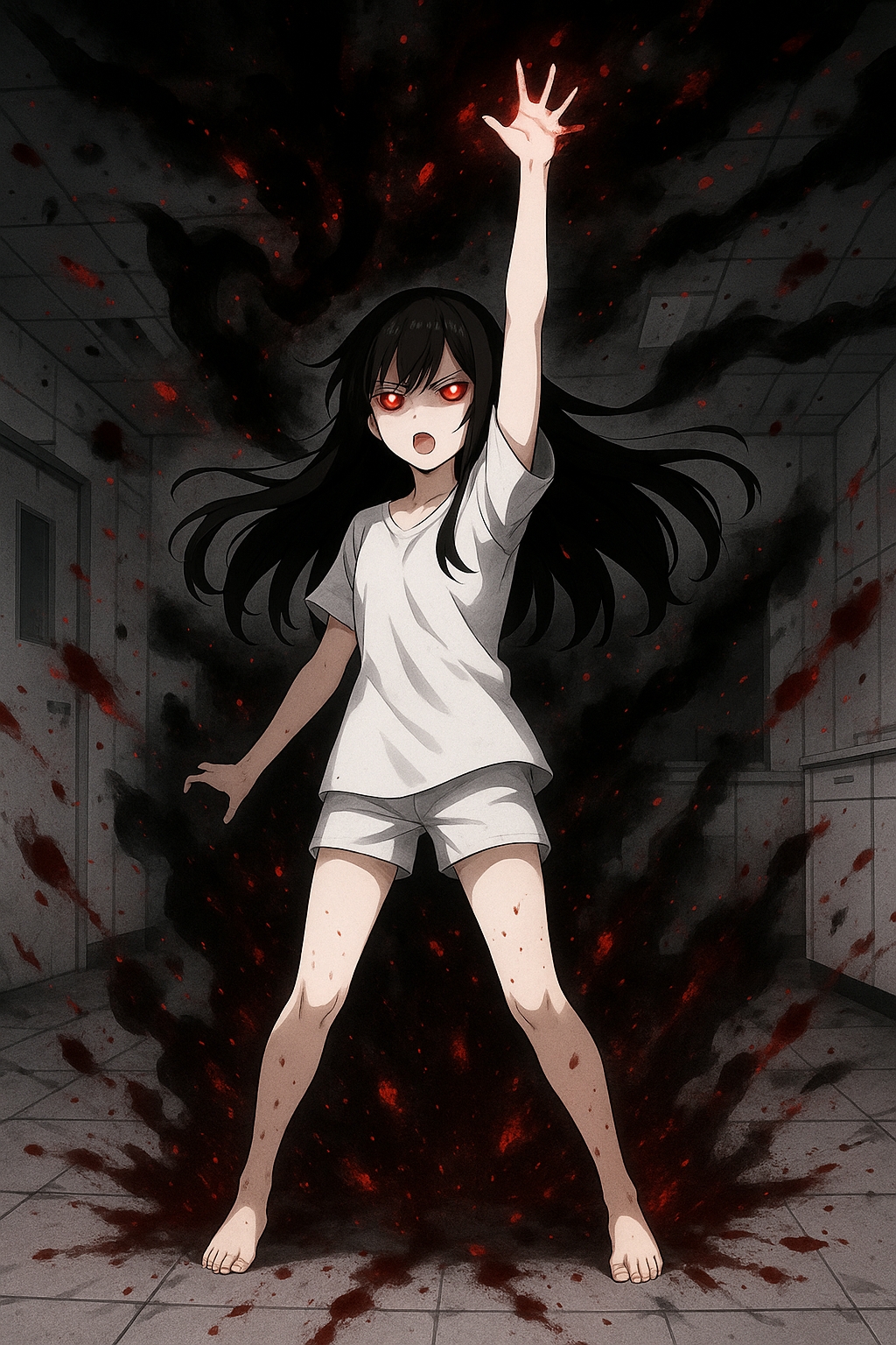 血痕の先、暗がりの中で影がゆっくり立ち上がる。