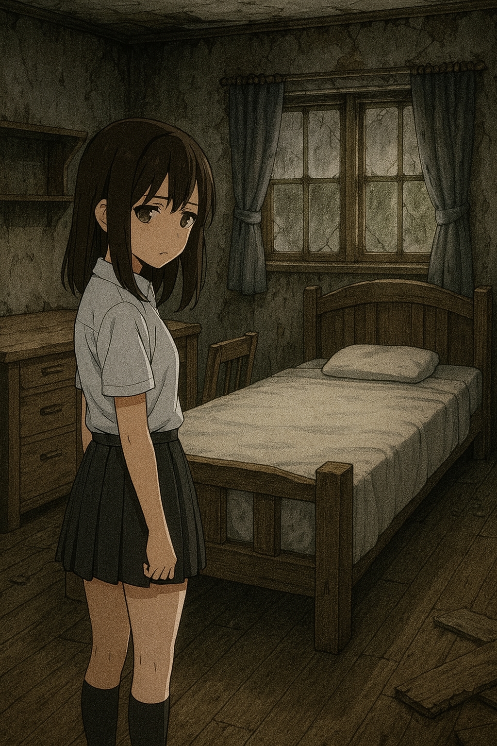 玄関の横、濁ったガラス窓――内側から打ち付けた板の隙間が、吸い込むみたいに黒かった。