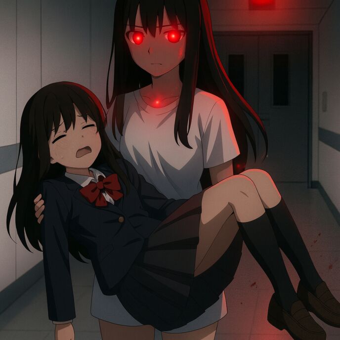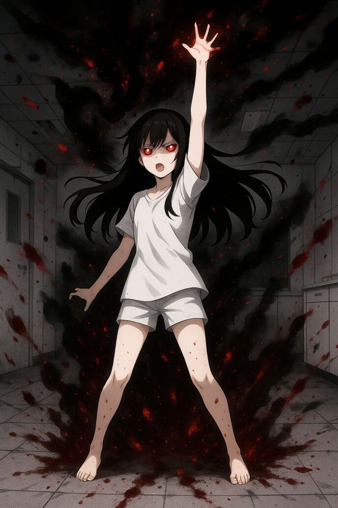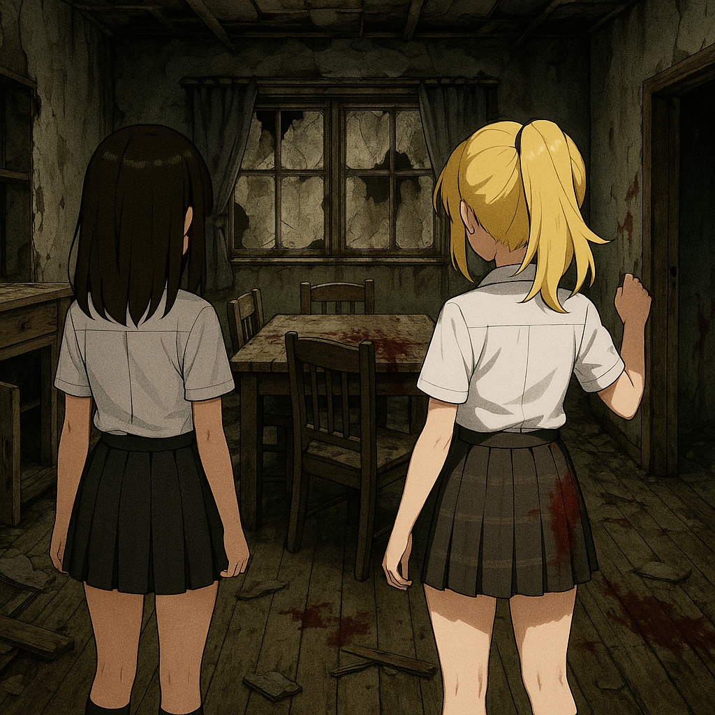 言葉と同時に、血の筋が続く先――暗い廊下の奥から、かすかな軋み音が返ってきた。