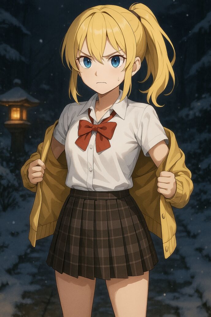 ミーナは鉄パイプを肩で回し、金具を一度鳴らす。小さな音なのに、雪もない踏み石がわずかに軋んで返事した。