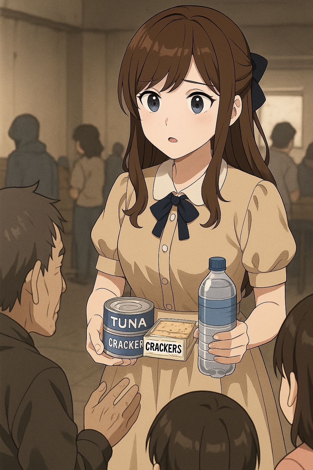 カルロッタは、避難所の隅に積まれた食料備蓄の箱を前にしゃがみ込み、