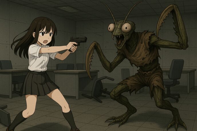 無言の死体が、まるで演劇のワンシーンのように、ただ座っていた。教卓の前に立つ教師らしき影も、血の通わぬように動かない。