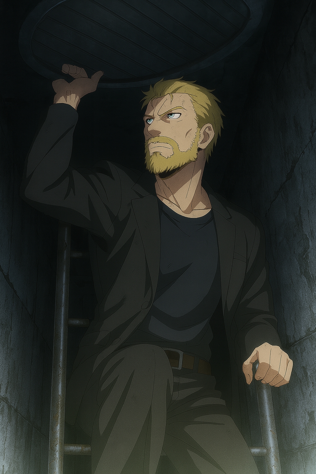 彼の腕の筋肉が浮かび上がり、鈍く光る鉄の蓋がキィ……と音を立てて浮き上がった。