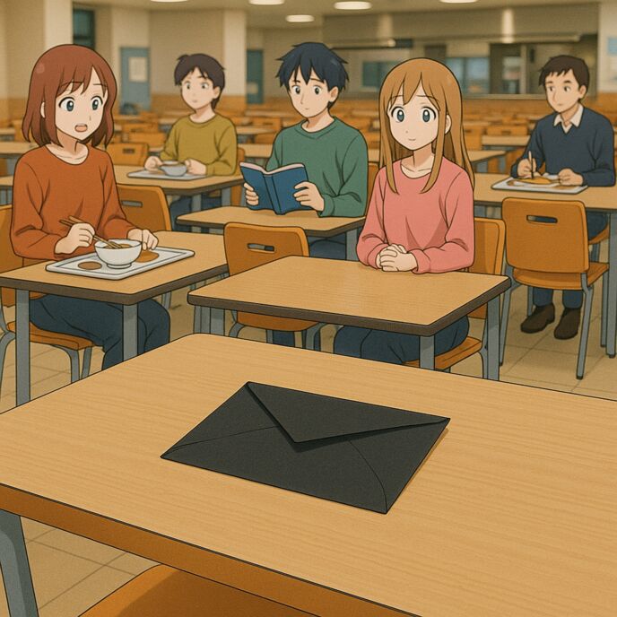 ルナが昼休み、学食の空いたテーブルで偶然目にした漆黒の封筒。